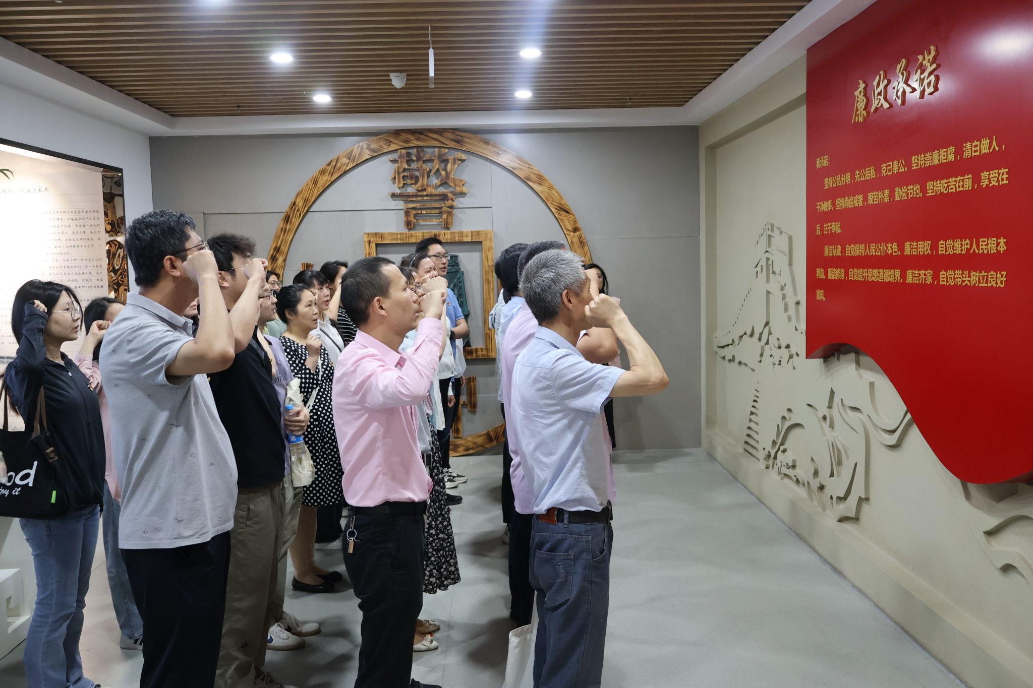 走进廉洁文化教育基地,跟随讲解人员的脚步,全体党员依次参观了政治铸魂、以案为鉴、崇法尚纪、家风传承四个展区,学习了党和国家领导人关于党风廉政建设的重要论述以及近年来我党反腐倡廉工作取得的成效。典型警示案例的深入剖析、落马官员的沉痛忏悔、真实还原的模拟监舍场景,提醒大家要时刻保持清醒,警钟长鸣。全体人员在学院党委书记张兵的带领下,一起宣读《廉政承诺》。