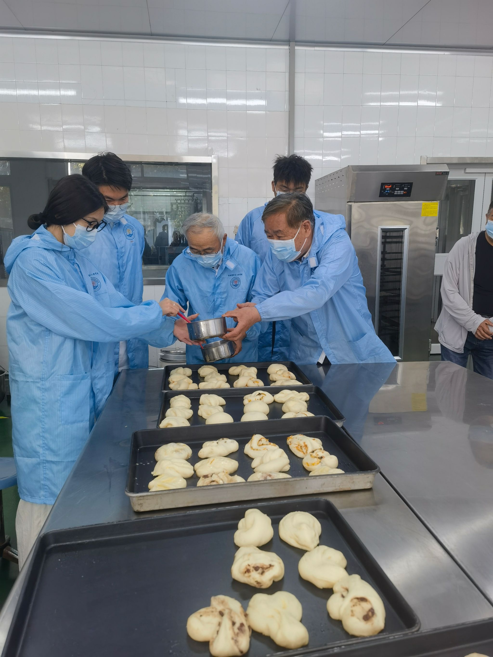 海洋食品与生物工程学院党委书记张兵代表学院热情欢迎到来的老党员们,向他们介绍了学院建设和发展的情况,并就关工委工作进行交流。随后,一行人在实验中心主任浦寅芳的带领下,先后参观了学院啤酒实训生产线、生物发酵生产线、烘焙食品实训室。在烘焙食品实训室,师生现场体验了面包烘焙,亲手制作面包,现场烤制,品尝成品。在其乐融融的氛围中,老党员们与学生亲切交流,分享从教经历,传授成长知识。