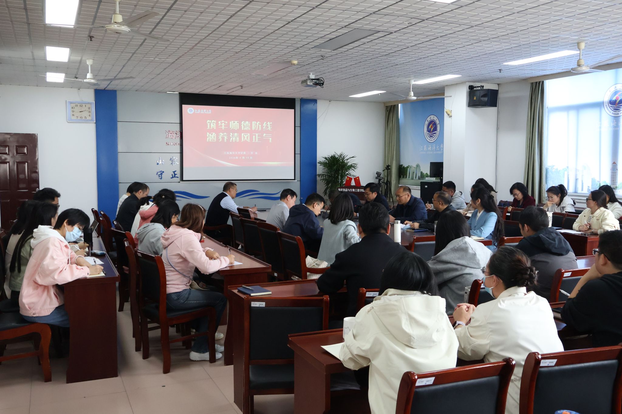 为深入贯彻全面从严治党要求,持续强化教师师德师风建设,引导广大教师坚守育人初心、严守职业底线,4月14日下午,海洋食品与生物工程学院邀请校纪委副书记李春在文达楼606作“筑牢师德防线 涵养清风正气”专题报告会,学院全体教职工参加。会议由院党委书记张兵主持。