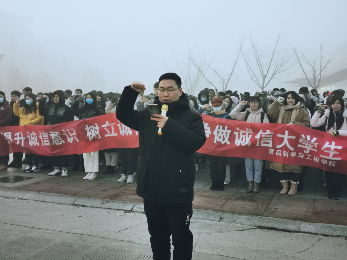12月28日早上六时四十分,食品科学与工程学院于第四食堂广场举行升旗和“提升诚信意识 树立诚信之风 争做诚信大学生”宣誓仪式,党总支副书记沈加君、辅导员、班主任及苍梧校区全体同学参加本次升旗仪式。升旗仪式由辅导员吴凡老师主持。