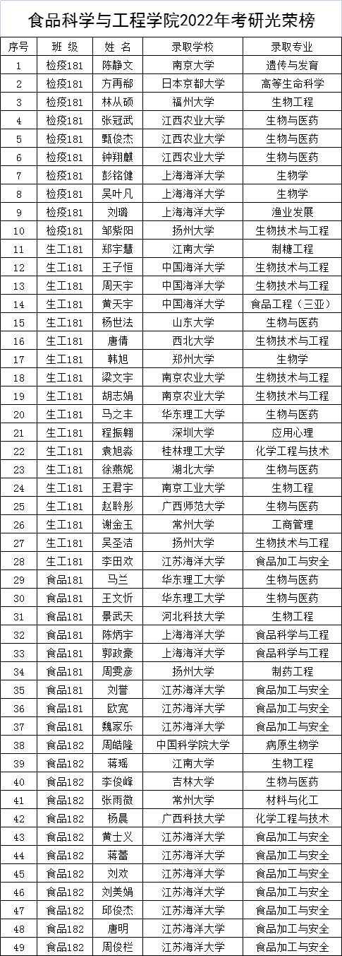 食品科学与工程学院2022届毕业生考研共上岸49人,考研率达36.56%。其中25人被中国科学院大学、江南大学、南京大学、山东大学、吉林大学、京都大学、中国海洋大学等海内外知名高校录取。诞生了一个学霸宿舍A10-201,宿舍四朵金花徐燕妮、郑宇慧、赵聆彤、袁旭淼全部上岸。