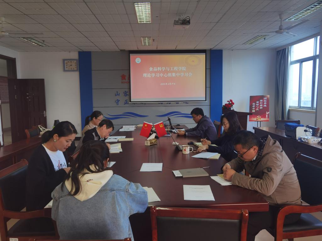 4月19日上午,食品科学与工程学院党总支理论学习中心组进行本学期第二次集中学习,学习习近平总书记在主题教育工作会议上的重要讲话精神、习近平总书记在广东考察时的重要讲话精神和《习近平关于国家粮食安全论述摘编》。