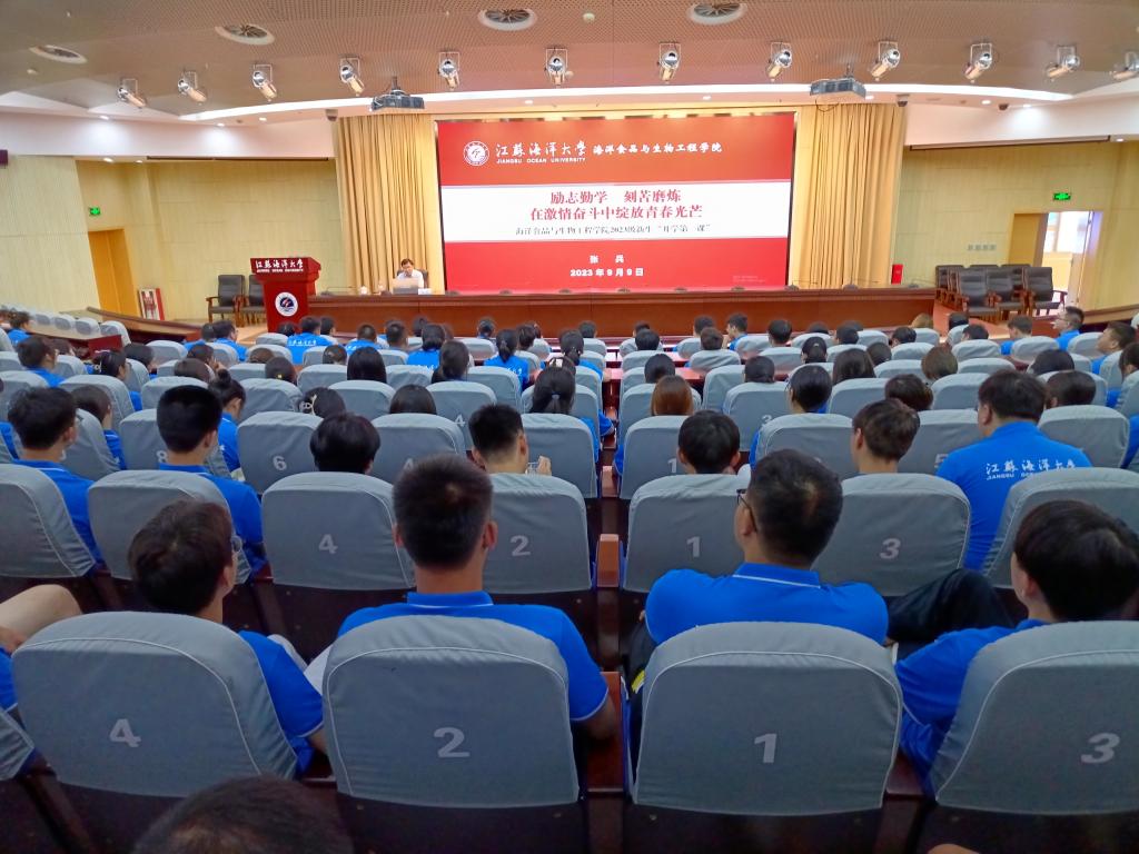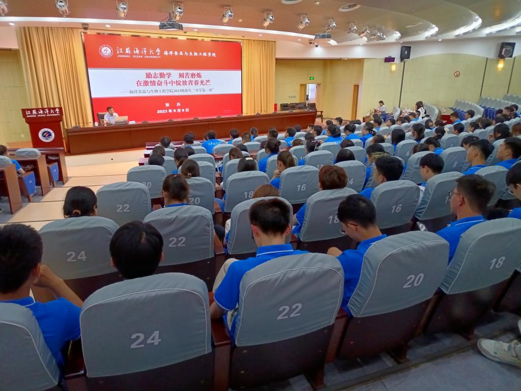 9月9日上午,海洋食品与生物工程学院2023级新生师生见面会后,学院党委书记张兵以“励志勤学,刻苦磨炼,在激情奋斗中绽放青春光芒”为主题,在黄海厅为2023级全体本科与研究生新生上开学第一课。全体新生班主任、辅导员及2023级新生共同参加。