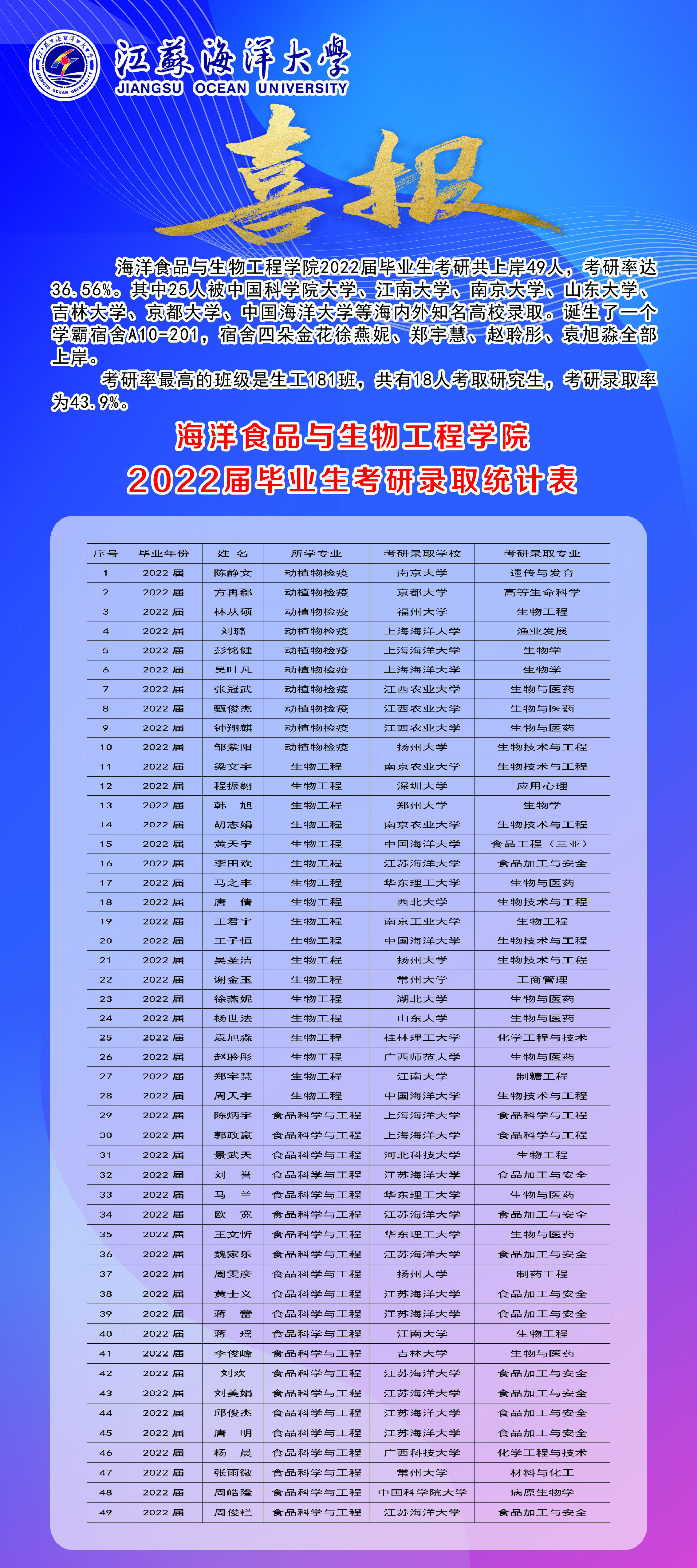 学院遵循“学生中心、成果导向、持续改进”的教育理念,逐步形成了学院人才培养特色。迎新现场展示近两年考研光荣榜,树立榜样,鼓励新生树立考研目标。在学院师生见面会、辅导员见面会和专业教育上引导大一新生做好大学生涯规划,明确学习目标,介绍各专业毕业生的就业去向,帮助新生了解就业方向。学院党委书记张兵以“励志勤学,刻苦磨炼,在激情奋斗中绽放青春光芒”为主题,为2023级全体本科与研究生新生上开学第一课,旨在引导新生“扣好大学第一粒扣子”,强化新生思想引领。组织大一新生在军训空余时间,来到烘焙实验室为全校新生做月饼。加强对学院在工程教育认证、国家一流专业建设、江苏省产教融合品牌专业建设、江苏省“十四五”重点学科建设等方面办学成果的宣传,引导新生了解专业、树立信心、刻苦学习,度过一个充满收获不断成长的大学美好时光。