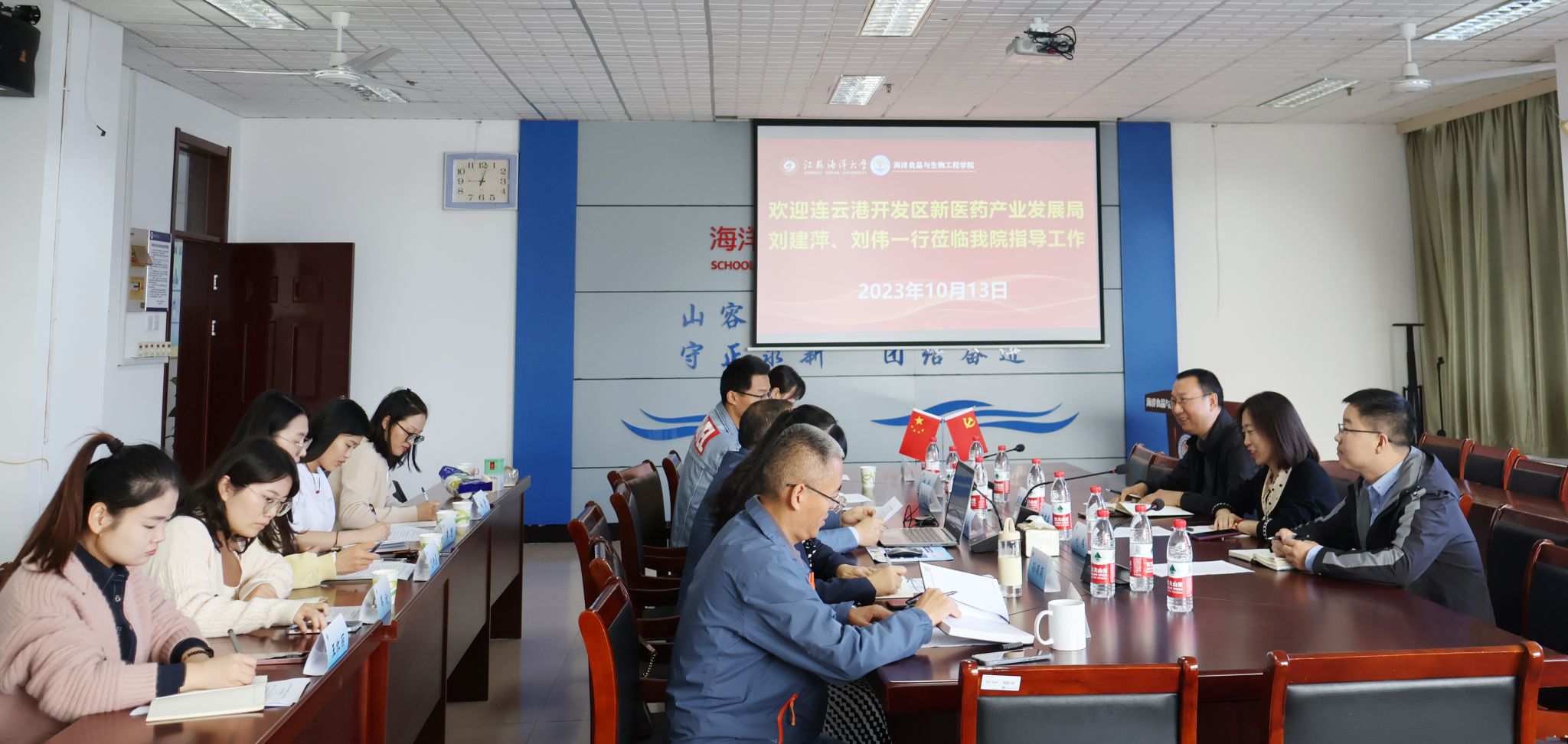 2023年10月13日上午,连云港开发区新医药产业发展局副局长刘建萍、产业发展处副处长刘伟一行到海洋食品与生物工程学院对接产学研合作工作,副院长盘赛昆和科研团队负责人以及部分教学科研骨干参加对接活动。活动由副院长盘赛昆主持。