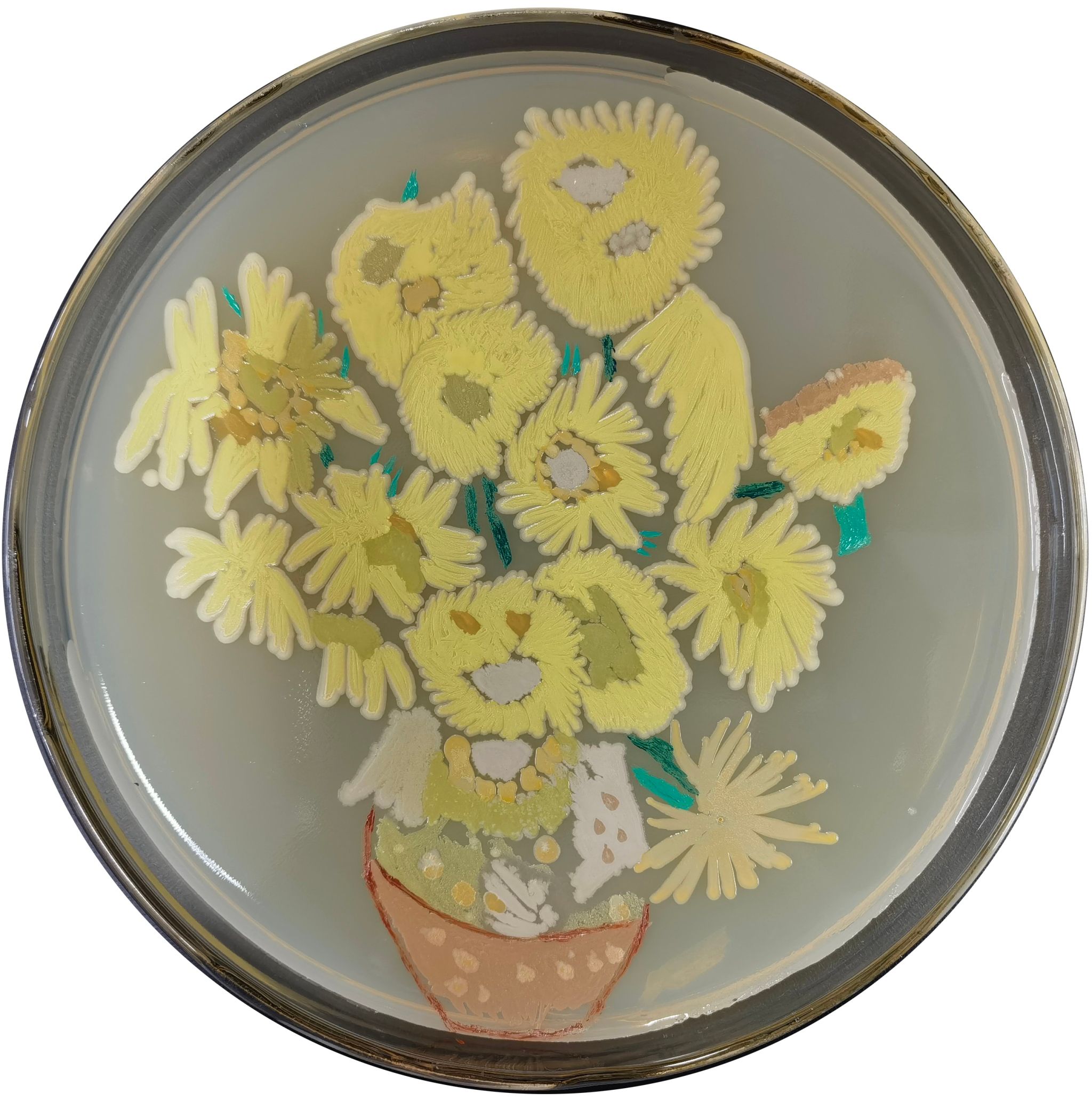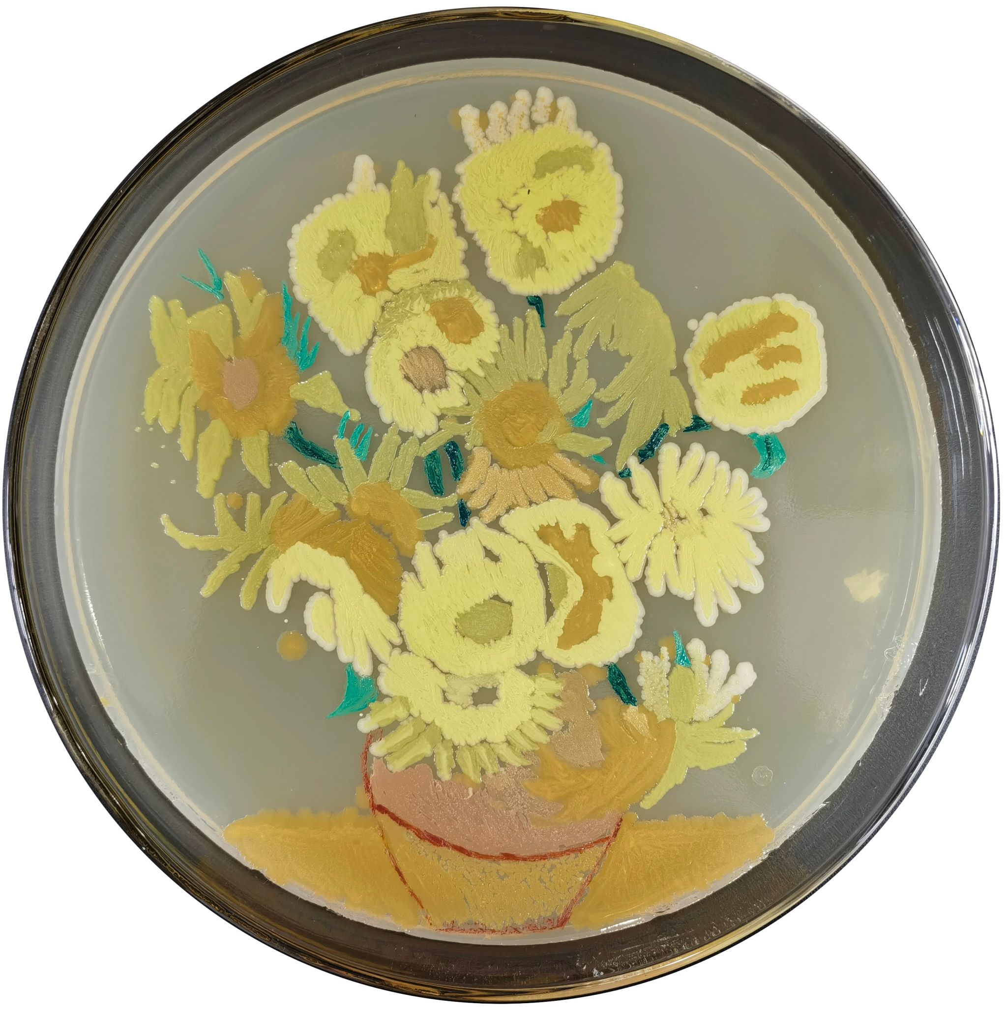 该作品以梵高名作《花瓶里的十五朵向日葵》(原作由38种绚烂多彩的黄色组成)为模版,以7种相似色调的橙黄色菌株(嗜根考克氏菌、阿氏芽孢杆菌、深海微小杆菌、嗜根考克氏菌、还原铬亮杆菌、金黄色葡萄球菌和植物乳杆菌)为“颜料”,在LB培养基上“画”出了这幅梵高的向日葵,致敬经典。