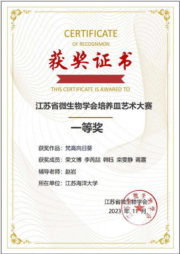 近日,江苏省微生物学会成功举办了首届“江苏省微生物学会培养皿艺术大赛”。我校海洋食品与生物工程学院赵岩老师带领学生荣文博、李芮喆、韩钰、栾雯静和蒋露创作的作品《梵高向日葵》,以色彩鲜亮、创意十足的表现在此次比赛中脱颖而出,获得了一等奖第一名的好成绩。