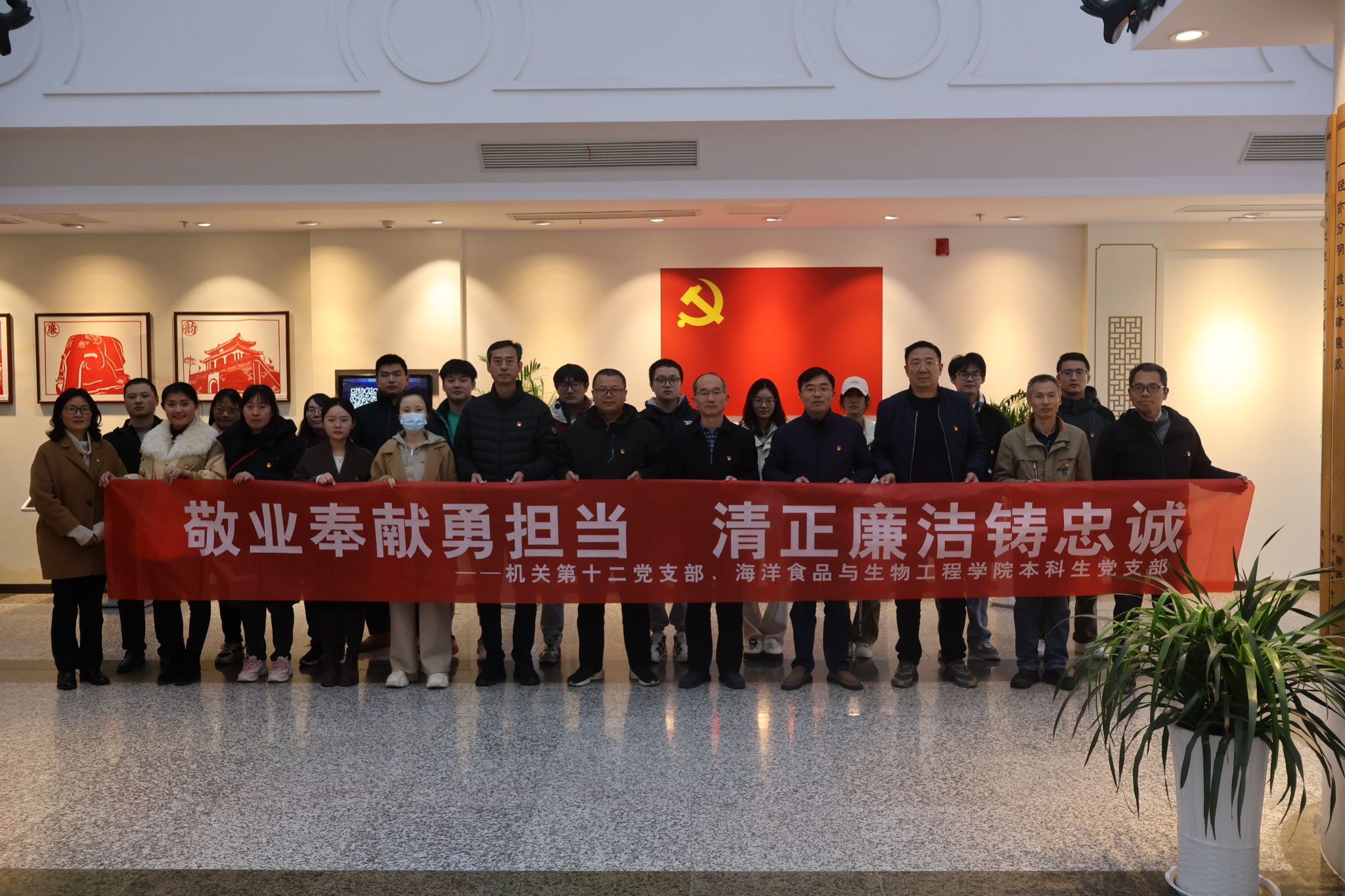为深入学习宣传贯彻党的二十大精神和江苏海洋大学第一次党代会精神,加强党风廉政建设,教育引导广大师生党员增强纪律意识、规矩意识,11月15日下午,机关第十二党支部、海洋食品与生物工程学院本科生党支部联合开展“敬业奉献勇担当 清正廉洁铸忠诚”主题党日活动。