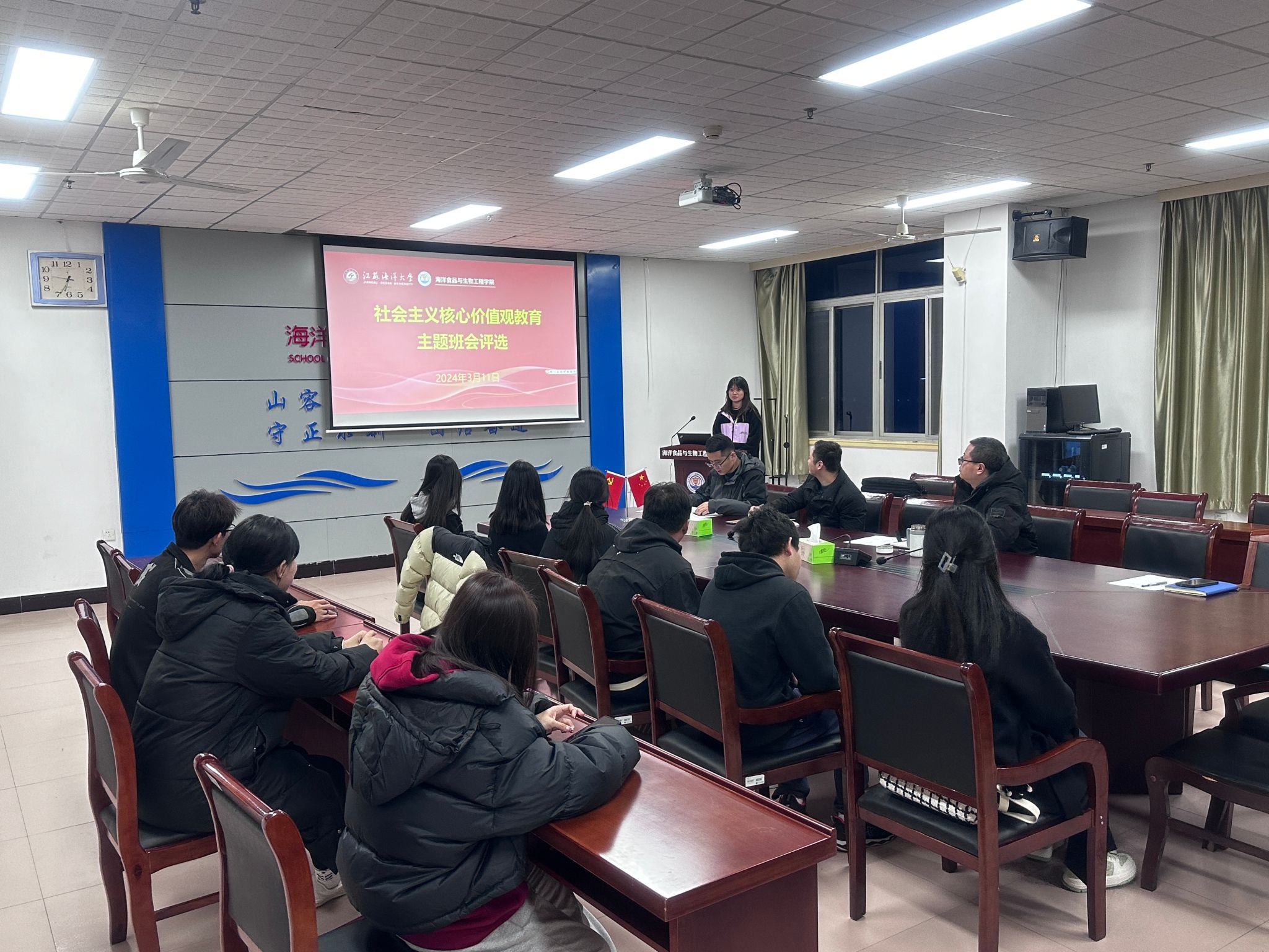 为贯彻落实立德树人根本任务,坚持不懈培育和弘扬社会主义核心价值观。3月11日晚上,海洋食品与生物工程学院在主楼606会议室举办社会主义核心价值观主题班会比赛。学院党委副书记郭利,辅导员吴凡、陈丽媛、杨鑫暖以及各班级代表参加比赛活动。