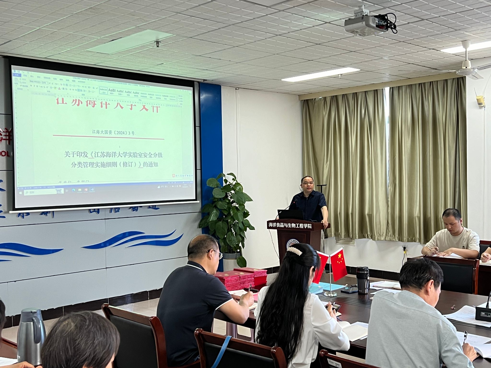 盘赛昆副院长传达了6月14日下午召开的校实验室建设与安全管理工作会议精神,带领师生学习《江苏海洋大学实验室安全分级分类管理实施细则(修订)》《江苏海洋大学实验室安全检查管理办法(修订)》《江苏海洋大学实验室与实验项目安全风险评估实施细则(试行)》等三个重要文件精神。