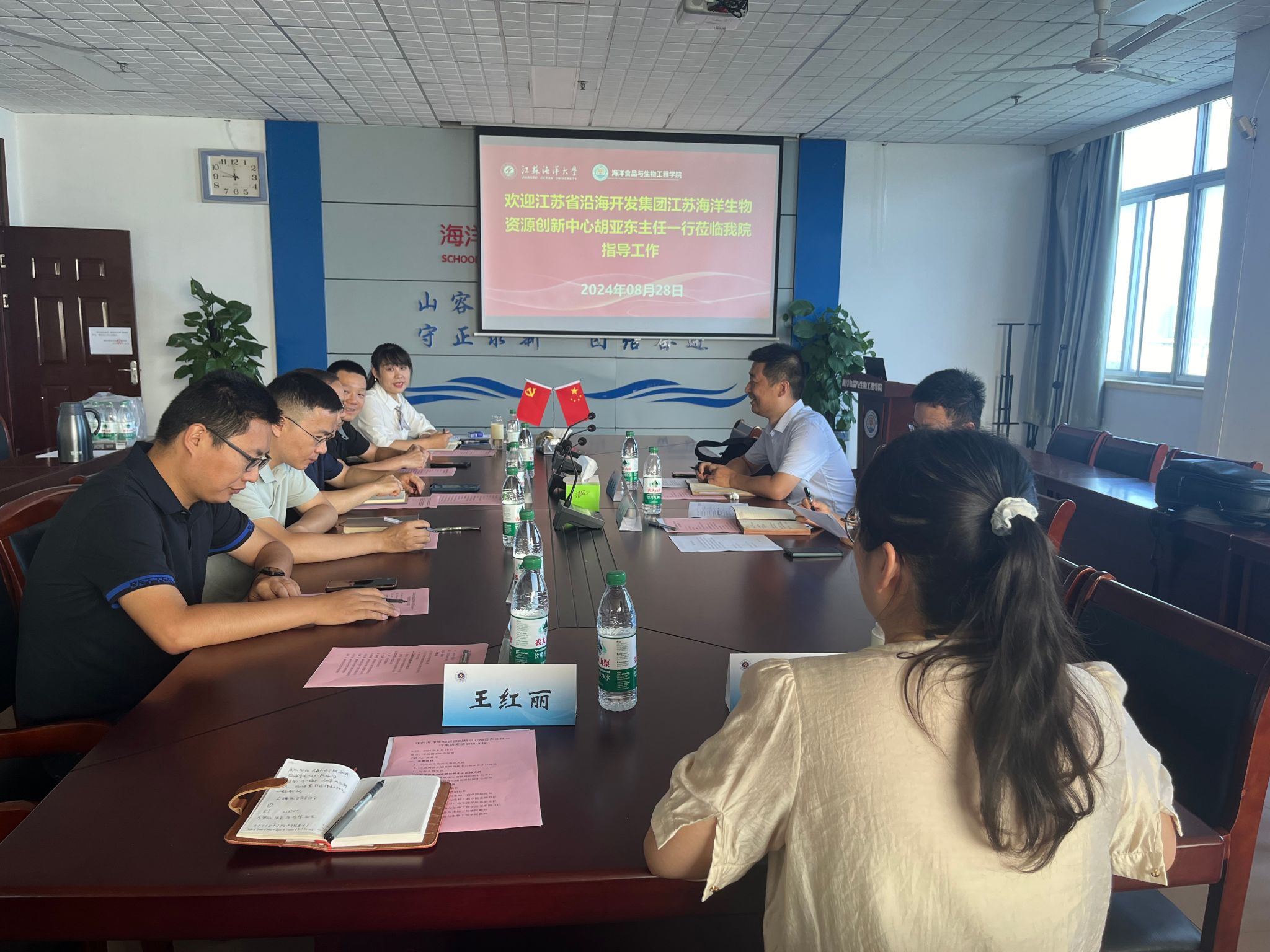 8月28日上午,江苏省沿海开发集团江苏海洋生物资源创新中心主任胡亚东、项目经理潘明轩等一行到访我院,调研人才培养、项目合作及及成果转化等,研究生院副院长高嵩、科学技术处副处长房耀维以及我院孙颖颖、王文彬、杨杰、王红丽、韦欣等教师代表参加交流会,交流会由副院长盘赛昆主持。