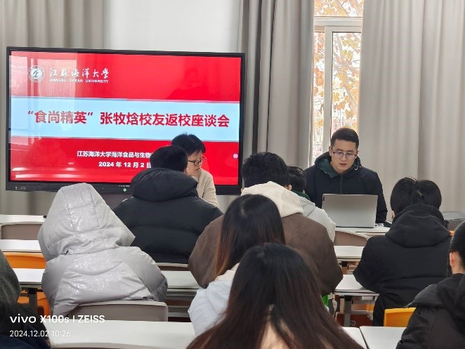12月2日上午,海洋食品与生物工程学院2003级校友张牧焓在A9/A10一站式学生社区会议室与本科在校生座谈交流,座谈会由辅导员杨鑫暖主持。张牧焓校友现为江苏省农业科学院副研究员。