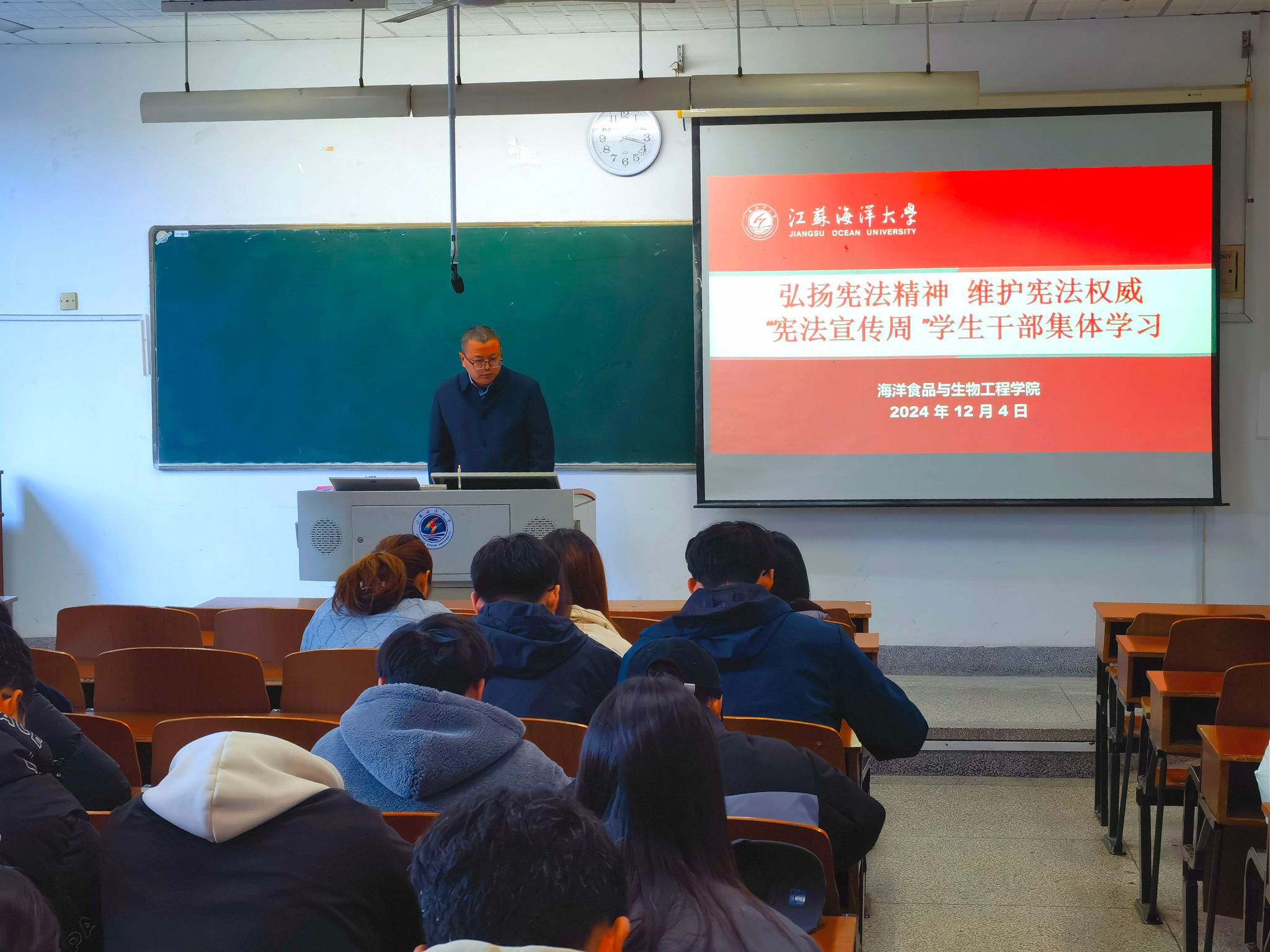 在国家宪法日来临之际,为进一步增强学生对宪法的认识和尊重,海洋食品与生物工程学院12月4日在苍梧校区文达楼108教室,举办了“宪法宣传周”集体学习会。集体学习由学院副书记郭利主讲,苍梧校区全体班级班干部参加,共同学习宪法知识,弘扬宪法精神。