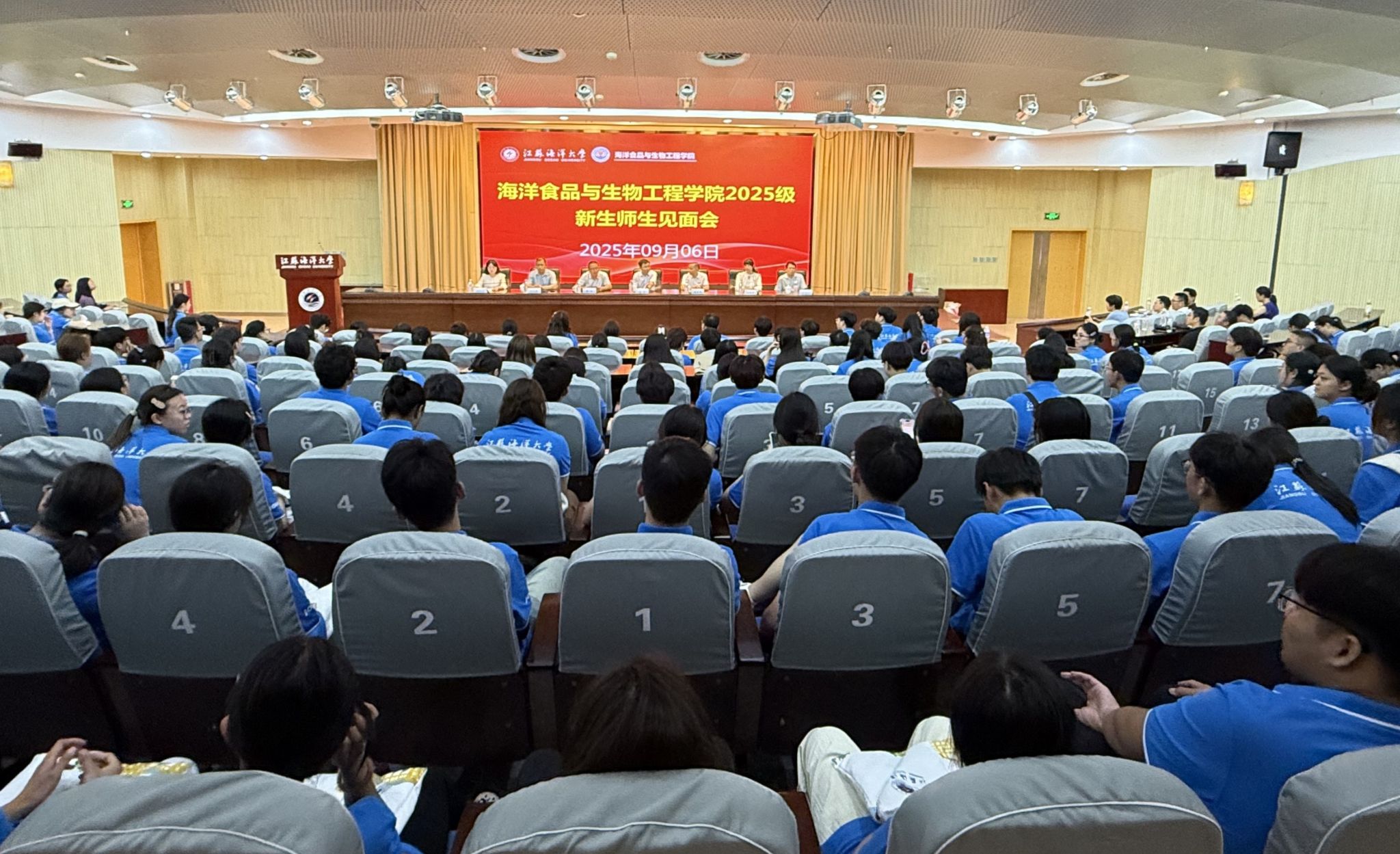 9月6日下午,江苏海洋大学海洋食品与生物工程学院2025级师生见面会在苍梧校区会议中心黄海厅隆重举行。海洋食品与生物工程学院党委书记张兵、副院长(主持工作)盘赛昆、党委副书记郭利、副院长孙颖颖以及全体系主任、系支部书记、本科新生班主任、研究生新生导师、全体辅导员、全体2025级本科与研究生新生共同参加师生见面会。会议由郭利主持。