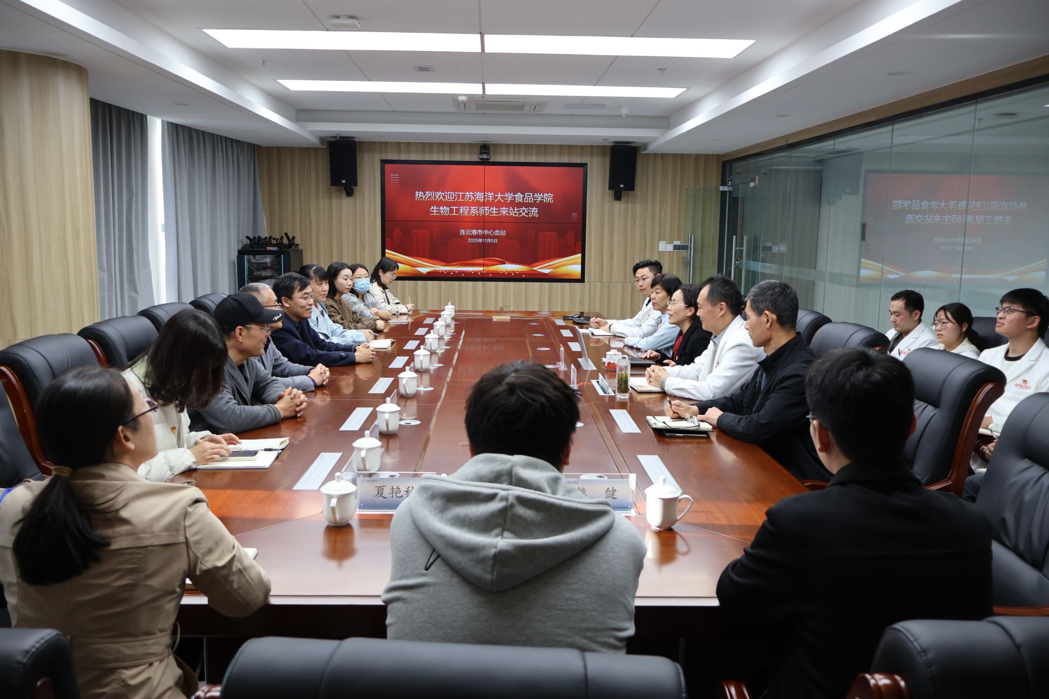 与会人员与连云港中心血站领导和有关工作人员召开了学习交流会。连云港中心血站党委书记、站长江荣对大家的到来表示欢迎,介绍了连云港中心血站有关情况。张兵介绍了海洋食品与工程学院有关情况,孙颖颖介绍了生物工程系党支部有关情况。与会人员围绕党支部建设、科学研究、人才培养、志愿服务等方面内容进行了深入交流。