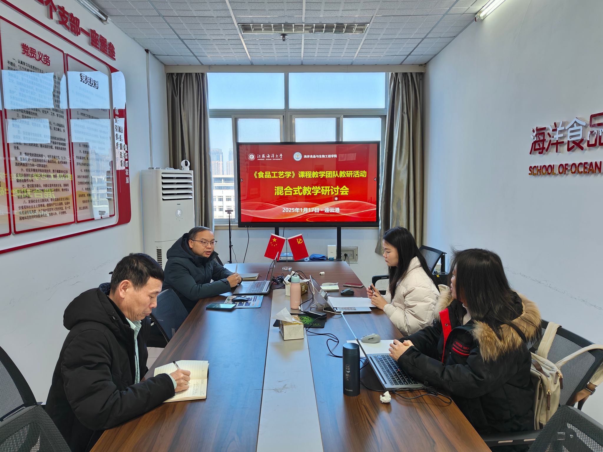 1月17日,海洋食品与生物工程学院食品工艺学课程组在文达楼604会议室召开混合式教学研讨会,课程组教师盘赛昆、邱春江、王红丽和李想老师参会。会议围绕下学期教学任务安排及混合式教学改革展开研讨,进一步明确了课程建设方向。