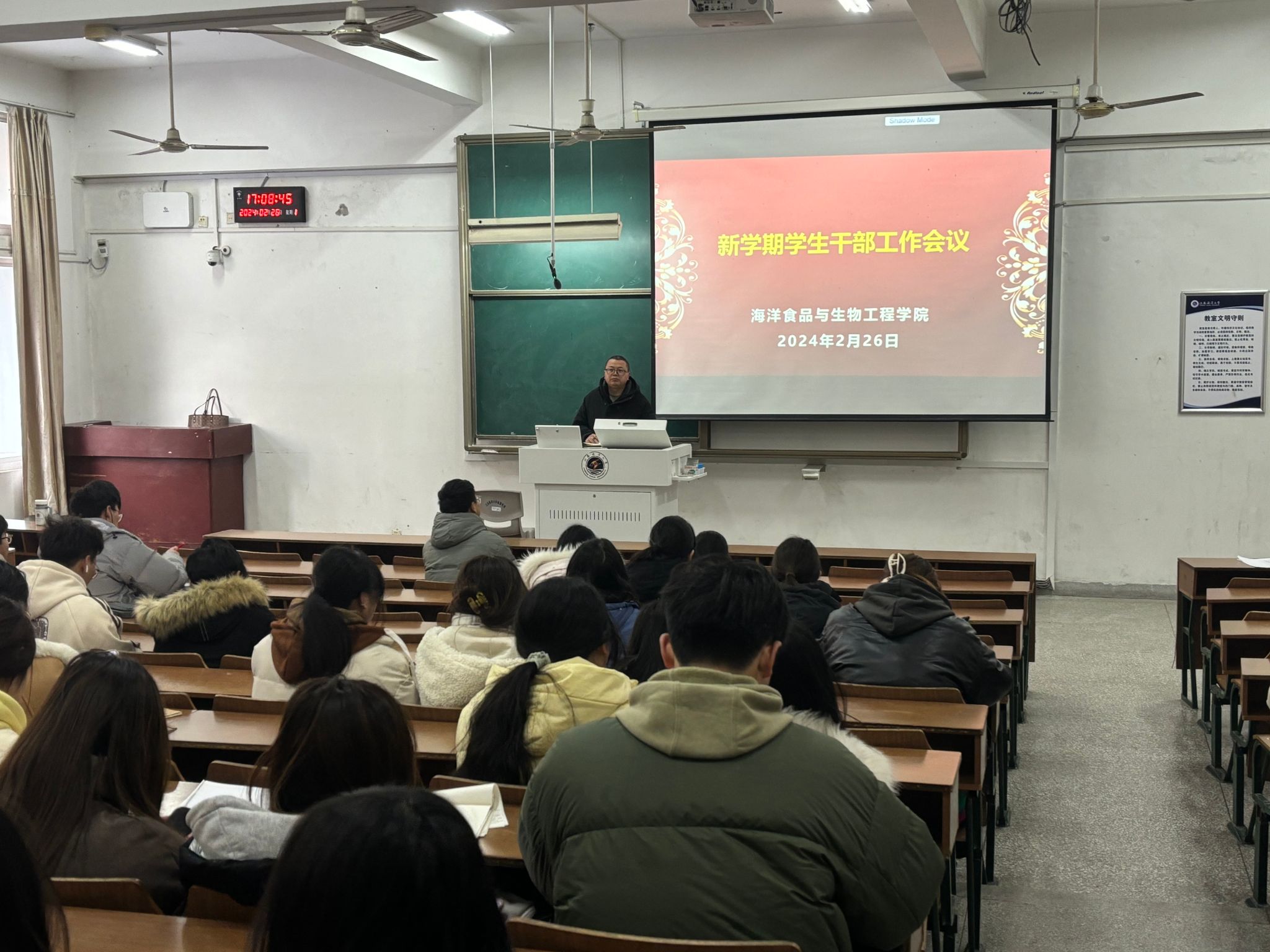 为做好新学期学生工作,2月26日下午,海洋食品与生物工程学院于文通楼124召开新学期首次全体学生干部工作会议。学院党委副书记郭利、辅导员吴凡、陈丽媛、杨鑫暖以及学院全体学生干部参加本次会议。