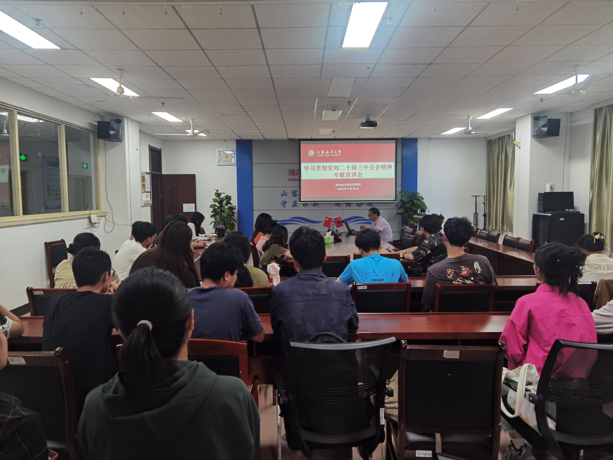 9月25日中午,海洋食品与生物工程学院在文达楼606会议室举办班级干部学习党的二十届三中全会精神报告会。学院党委副书记郭利、团委书记吴凡以及本科与研究生主要班级干部共同参加学习。