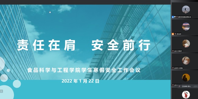 1月22日下午,食品科学与工程学院以“责任在肩、安全前行”为主题,在线上召开寒假学生安全暨心理健康工作会议,传达学习全省及我校学生心理健康教育工作会议精神,布置寒假期间学生安全工作。学院党总支书记田德勇、副书记郭利、全体班主任、全体辅导员、全体心理委员、各班主要班干部、全体学生党员共120多人参加会议。辅导员陈丽媛主持会议。