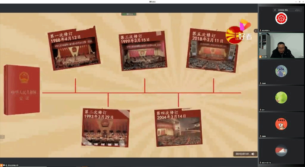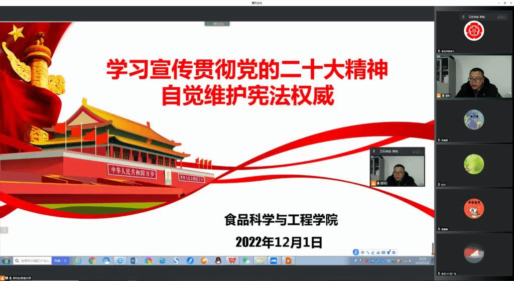 12月1日晚,食品科学与工程学院本科与研究生各班级全体班干部、全体宿舍长、全体学生党员共270余人在线上共同学习宪法。学院党总支书记张兵、党总支副书记郭利、辅导员吴凡、辅导员杨鑫暖参加学习会。会议由郭利主持。大家在线上认真观看了《中国宪法的诞生与发展历程》《新中国首部宪法杭州西湖诞生记》《宪法的颜色》《一分钟了解中华人民共和国宪法》《宪法守护一生》等宪法宣传视频。