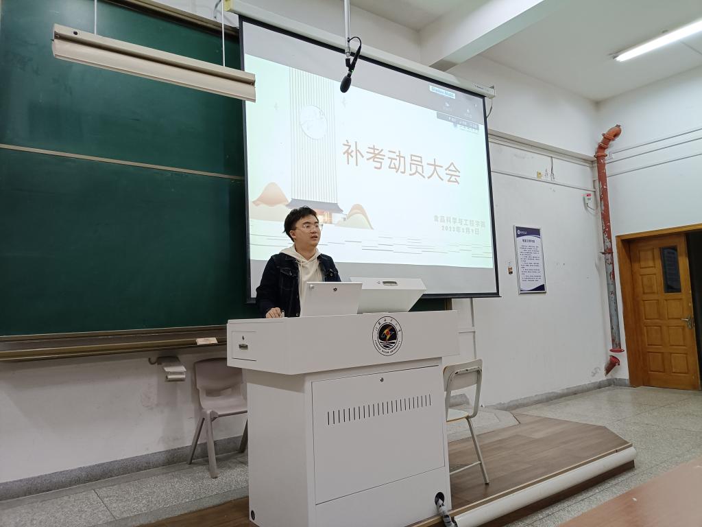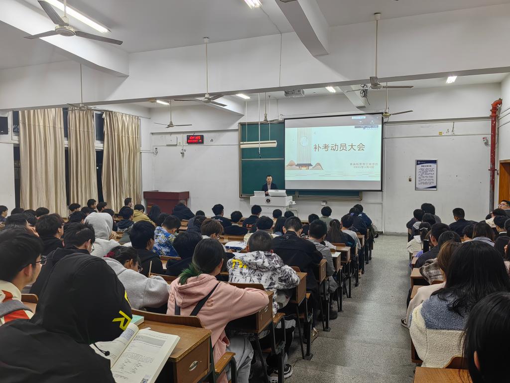 3月9日晚,食品科学与工程学院在文通楼124教室召开学期补考动员大会。学院党总支副书记郭利,辅导员吴凡、陈丽媛,研究生沈祥皓、阚佳与全体参加补考的学生共同参加会议。