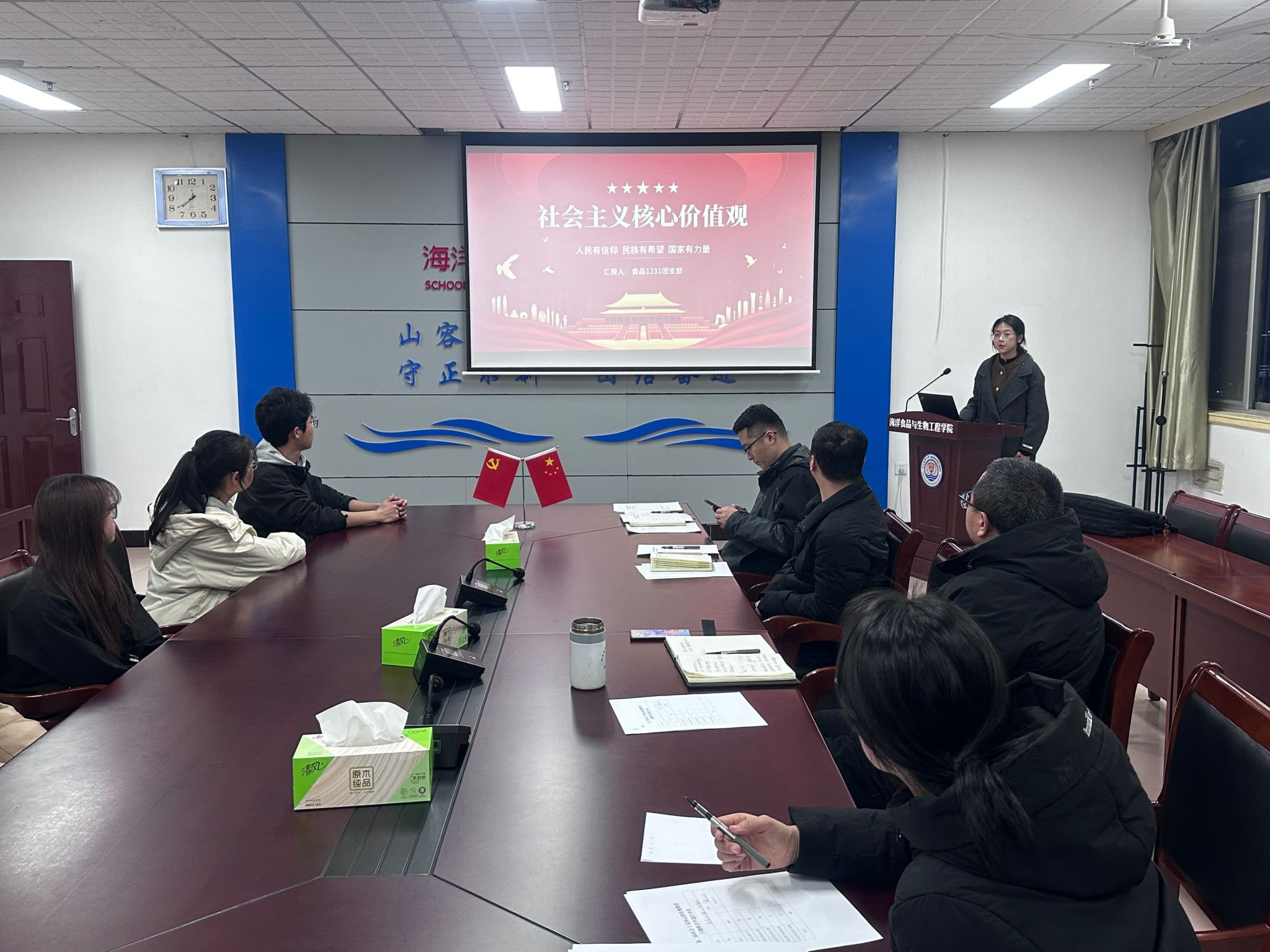 为贯彻落实立德树人根本任务,坚持不懈培育和弘扬社会主义核心价值观。3月11日晚上,海洋食品与生物工程学院在主楼606会议室举办社会主义核心价值观主题班会比赛。学院党委副书记郭利,辅导员吴凡、陈丽媛、杨鑫暖以及各班级代表参加比赛活动。