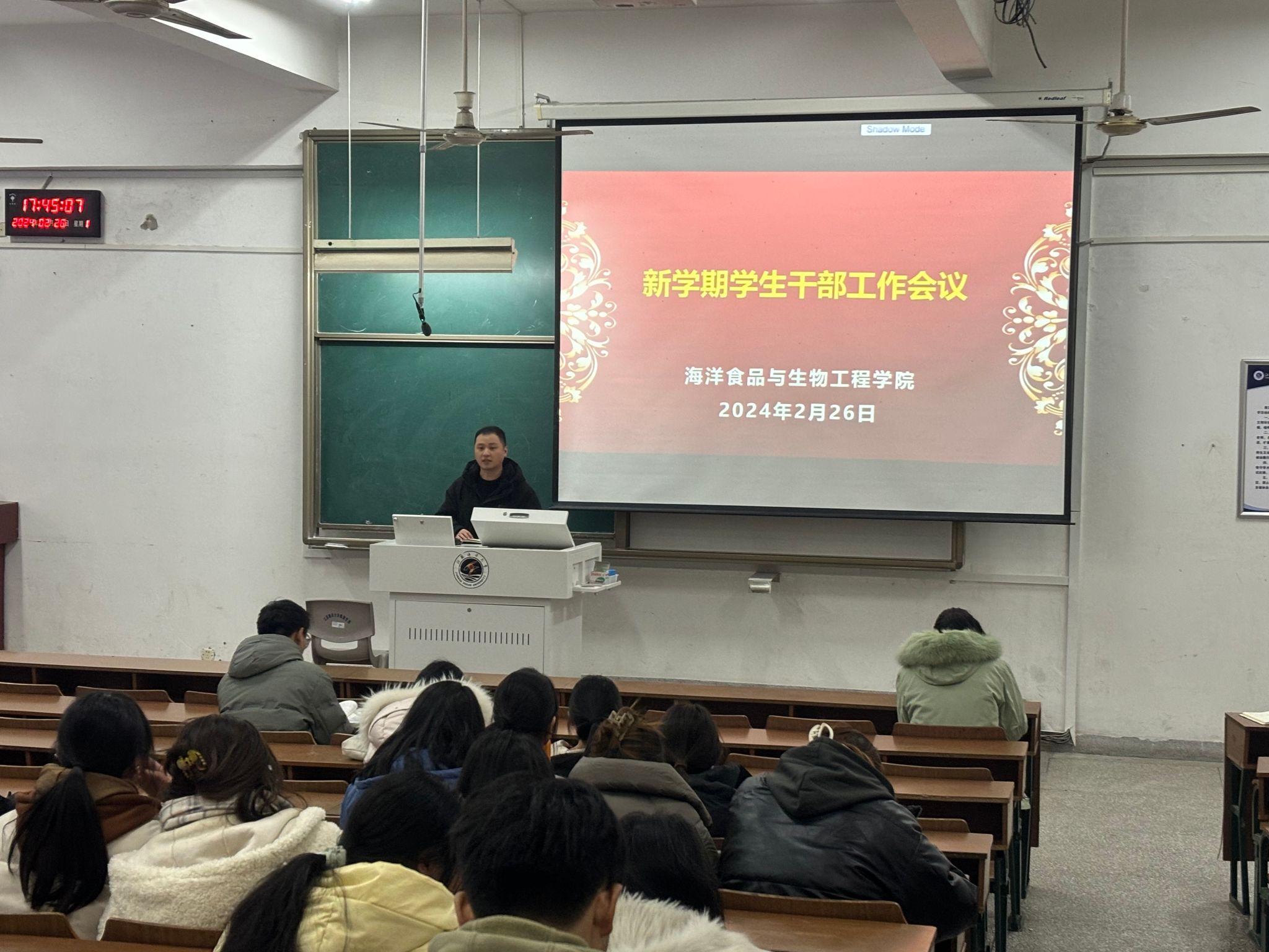 为做好新学期学生工作,2月26日下午,海洋食品与生物工程学院于文通楼124召开新学期首次全体学生干部工作会议。学院党委副书记郭利、辅导员吴凡、陈丽媛、杨鑫暖以及学院全体学生干部参加本次会议。