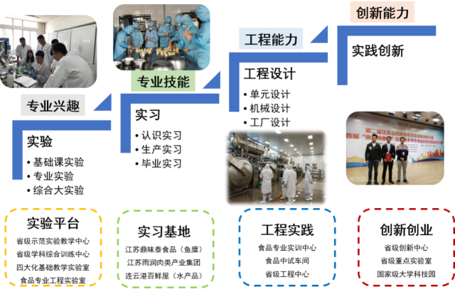 校内实训,建有鱼糜制品实训生产线、肉制品实训生产线、多功能饮料实训生产线、啤酒实训生产线、生物发酵生产线、粉状产品成套设备、焙烤食品实训生产线、智能感官鉴评系统等工程化实践实训装备,拥有超临界CO2萃取系统、超临界水氧化装置、超高压食品处理系统、液氮速冻机、高速旋转压片机、胶囊充填机、全自动杀菌釜等关键设备,拥有高效液相色谱仪、氨基酸分析仪、质构仪、流变仪、蛋白质测定仪等分析测试仪器。